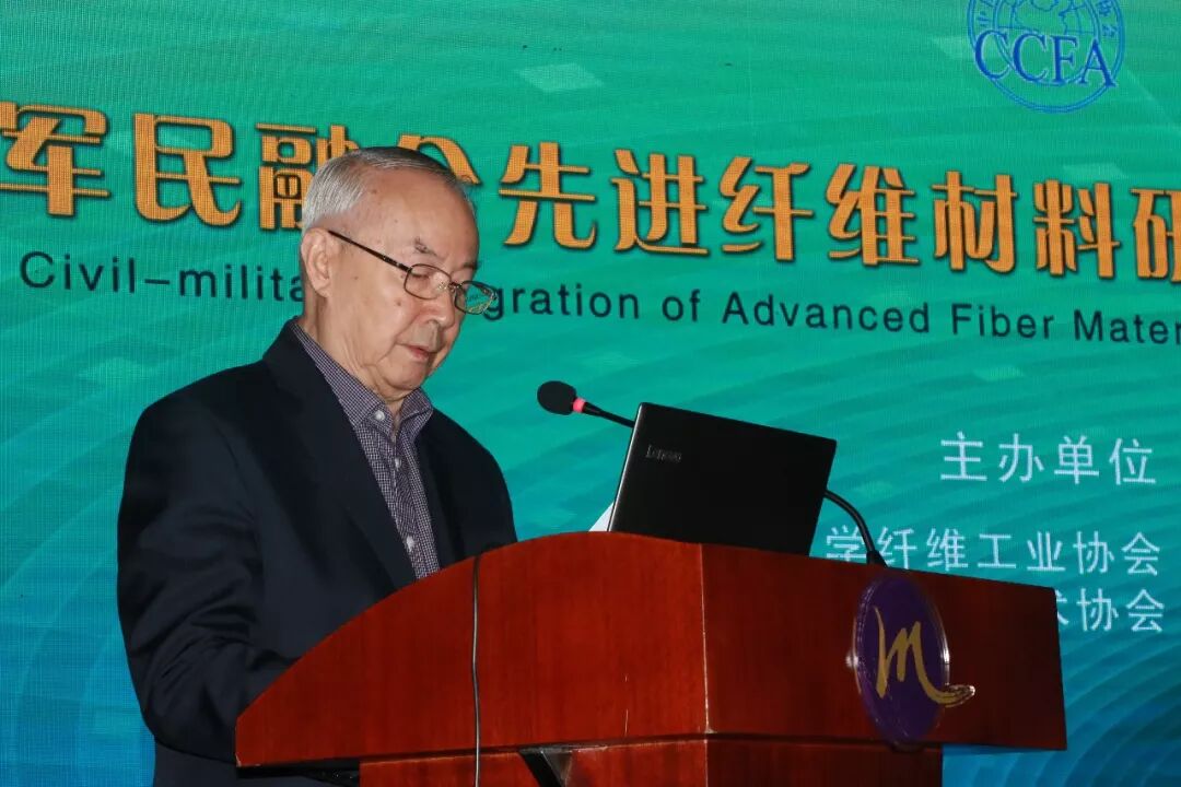 分论坛中,“军民融合先进纤维材料研发与应用发展战略论坛”由中国化学纤维工业协会、中国和平利用军工技术协会共同主办,中国化学纤维工业协会高新技术纤维专业委员会、化纤产业技术创新战略联盟、国家纺织化纤产品开发中心、北京服装学院、东华大学高性能纤维及制品教育部重点实验室(B)协办。中国纺织工业联合会副会长、中国化学纤维工业协会会长端小平,国家工信部消费品工业司调研员陈新伟,中国工程院院士蔣士成、俞建勇,全军武器装备采购组谭云刚,中国化学纤维工业协会副会长玉萍,中国人民解放军总后勤部军需生产技术研究所副所长赵继军等领导应邀出席论坛。